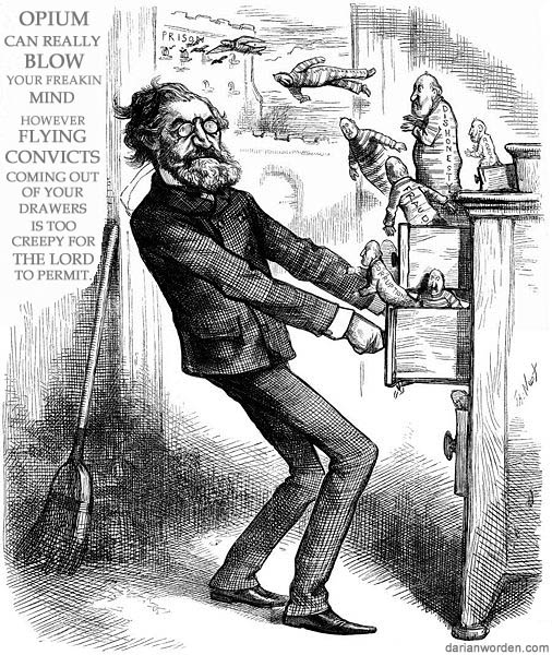 Los opositores del consumo de opio usaron la asociación de éste con los chinos para promover su prohibición tanto en los Estados Unidos como en las Filipinas. Sus argumentos eran muy sencillos. Primero, tanto en las Filipinas como en los Estados Unidos los chinos eran representados como extranjeros, es decir, como entes que no pertenecían a la “nación”. Si sólo los chinos fumaban opio, entonces, su ilegalización no afectaría a quienes sí eran considerados parte de la “nación”. De esta forma, la prohibición de lo opiáceos sólo afectaría no sólo a un sector minoritario, sino racial y culturalmente ajeno, foráneo, extraño. Segundo, la obsesión de los chinos con el opio era presentada como evidencia de cómo éstos rechazaban la integración en la cultura norteamericana. El consumo de opio entre los chinos residentes en los Estados Unidos era visto como una práctica anti-norteamericana que reflejaba un claro rechazo de la cultura y la forma de vida estadounidenses; como una prueba de que los chinos no querían incorporarse a la cultura. Tercero, los fumaderos de opios eran presentados como centros de perdición, donde jóvenes mujeres blancas eran corrompidas y convertidas en drogadictas, y en esclavas sexuales de hombres chinos. En conclusión, los estadounidenses usaron la imagen del opio como un vicio chino para marcar diferencias raciales, nacionales, culturales y hasta morales. De ahí que se alegara que la prohibición del consumo de opio sólo afectaría a un grupo minoritario y extranjero, que, además, rechazaba integrarse culturalmente y que corrompía con su vició a la sociedad estadounidense. Con ello se obviaba la amplitud y el carácter multiétnico del consumo de opio en los Estados Unidos.