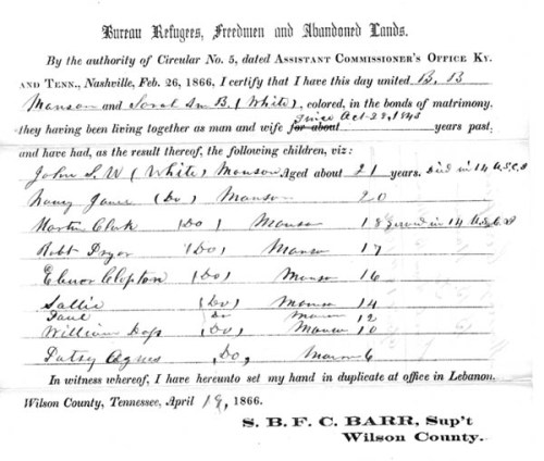Certificado de matrimonio emitido por el Freddmen Bureau, 1866.