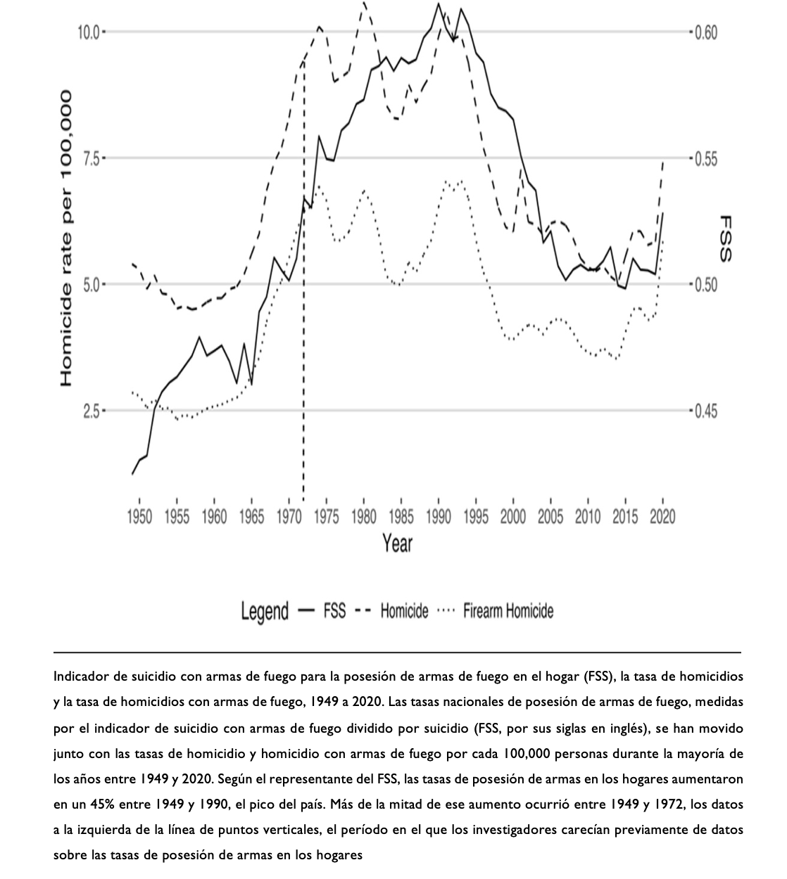 Indicador de suicidio con armas de fuego para la posesión de armas de fuego en el hogar (FSS), la tasa de homicidios y la tasa de homicidios con armas de fuego, 1949 a 2020. Las tasas nacionales de posesión de armas de fuego, medidas por el indicador de suicidio con armas de fuego dividido por suicidio (FSS, por sus siglas en inglés), se han movido junto con las tasas de homicidio y homicidio con armas de fuego por cada 100,000 personas durante la mayoría de los años entre 1949 y 2020. Según el representante del FSS, las tasas de posesión de armas en los hogares aumentaron en un 45% entre 1949 y 1990, el pico del país. Más de la mitad de ese aumento ocurrió entre 1949 y 1972, los datos a la izquierda de la línea de puntos verticales, el período en el que los investigadores carecían previamente de datos sobre las tasas de posesión de armas en los hogares.